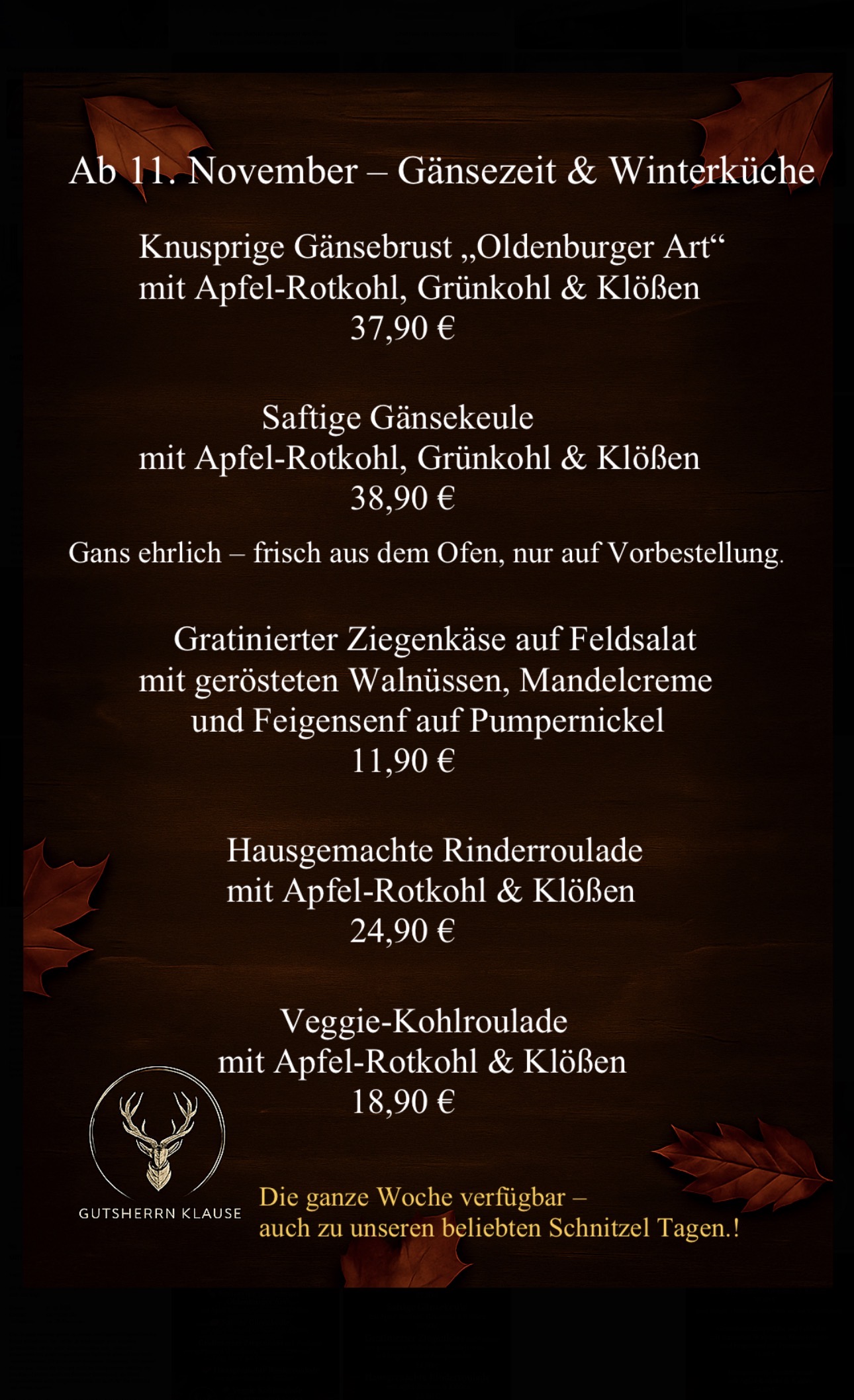 Sonntag und Feiertage: 11.30 – 21.30Uhr / Warme Küche 21.00 Uhr
